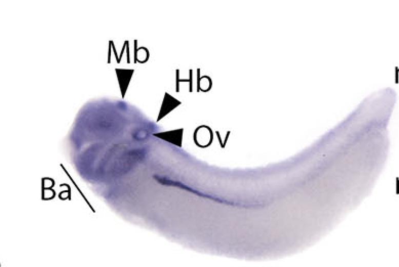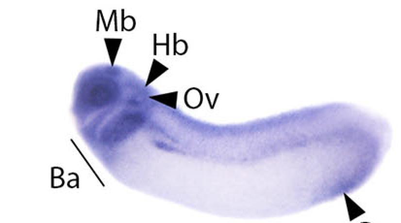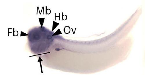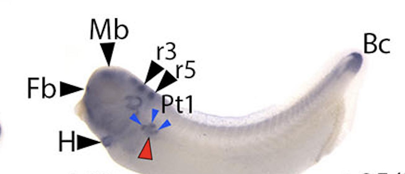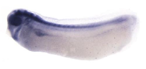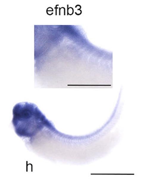 efnb3 (ephrin B3) gene expression in X. laevis embryo, assayed whole-mount via situ hybridization (WISH) at NF stage 25, lateral view anterior left, dorsal up.