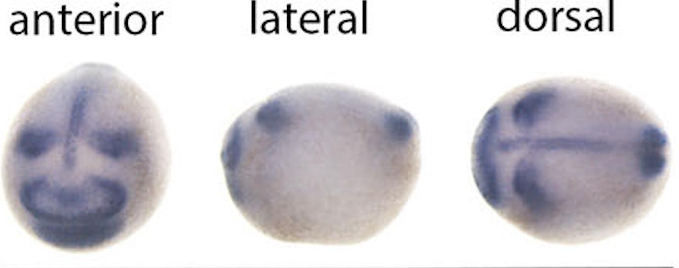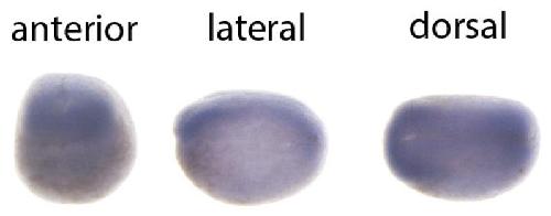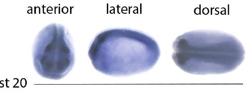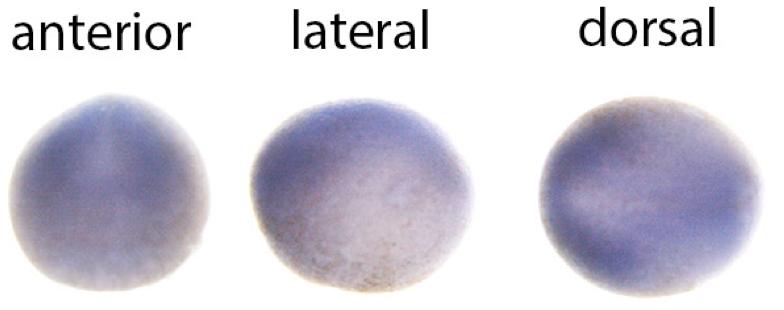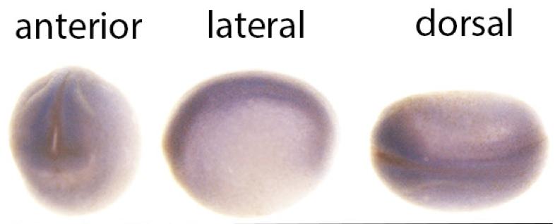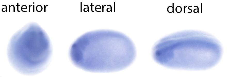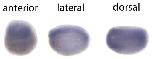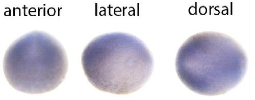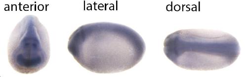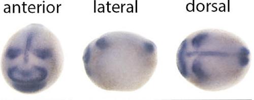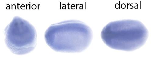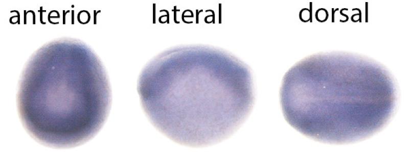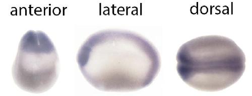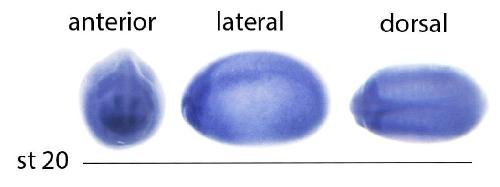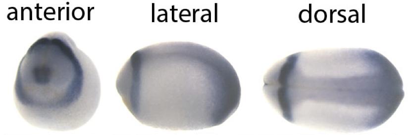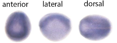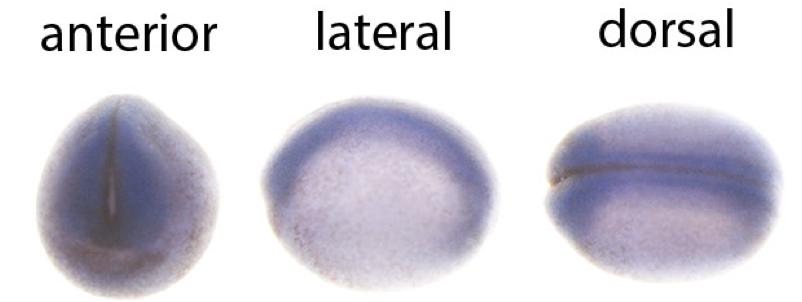 efnb1 (ephrin B1) gene expression in X. laevis embryo, assayed whole-mount via in situ hybridization (WISH) at NF stage 20, nterior, lateral and dorsal views.