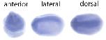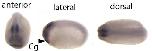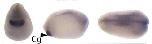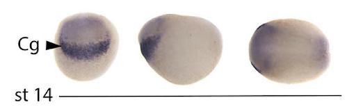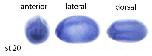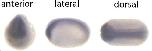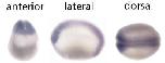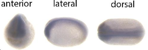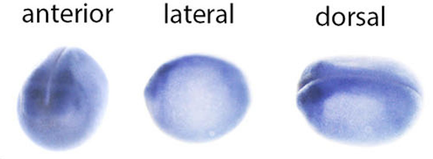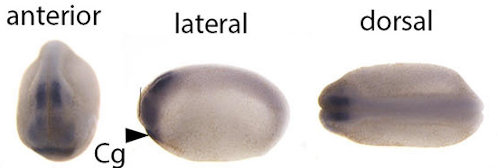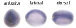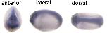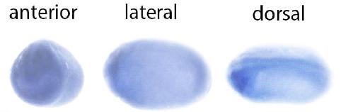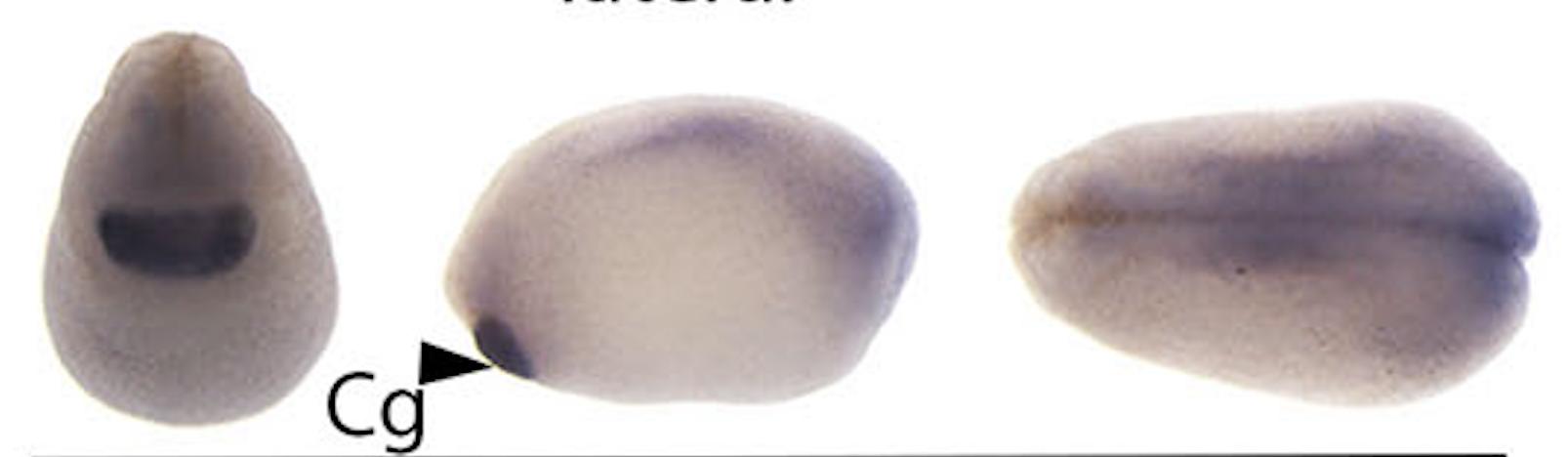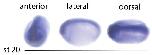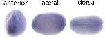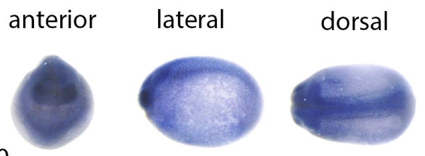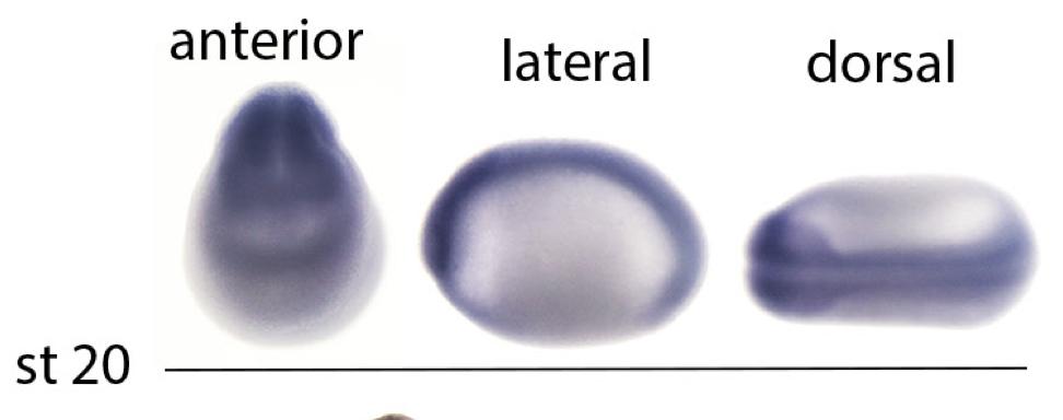 efnb1 (ephrin B1) gene expression in X. laevis embryo, assayed whole-mount via in situ hybridization (WISH) at NF stage 20, nterior, lateral and dorsal views.