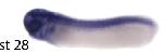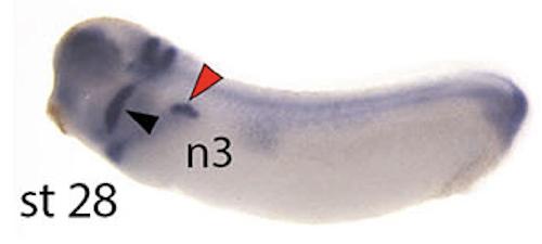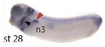 efnb3 (ephrin B3) gene expression in X. laevis embryo, assayed whole-mount via situ hybridization (WISH) at NF stage 28, lateral view anterior left, dorsal up.