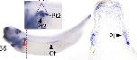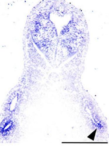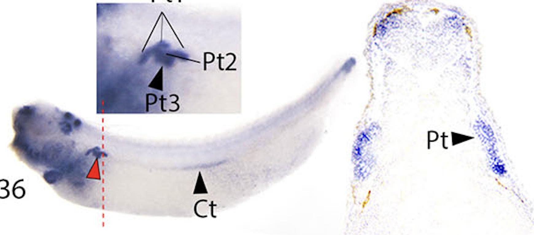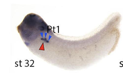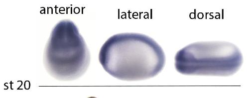 efnb2 (ephrin B2) gene expression in X. laevis embryo, assayed whole-mount via situ hybridization (WISH) at NF stage 20, anterior, lateral view and dorsal views.