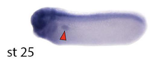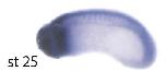 efna1 (ephrin A1) gene expression in X. laevis embryo, assayed whole-mount via situ hybridization (WISH) at NF stage 25, lateral view, anterior left, dorsal up.