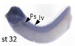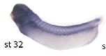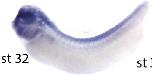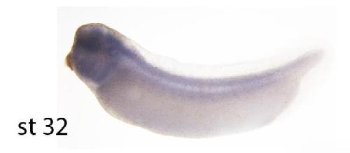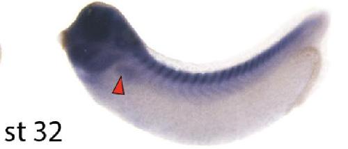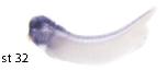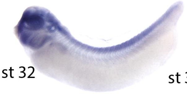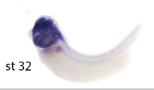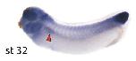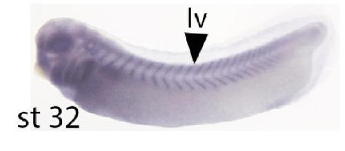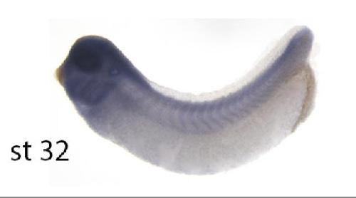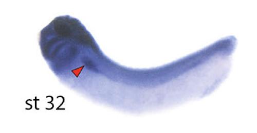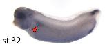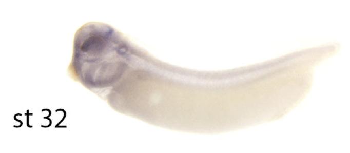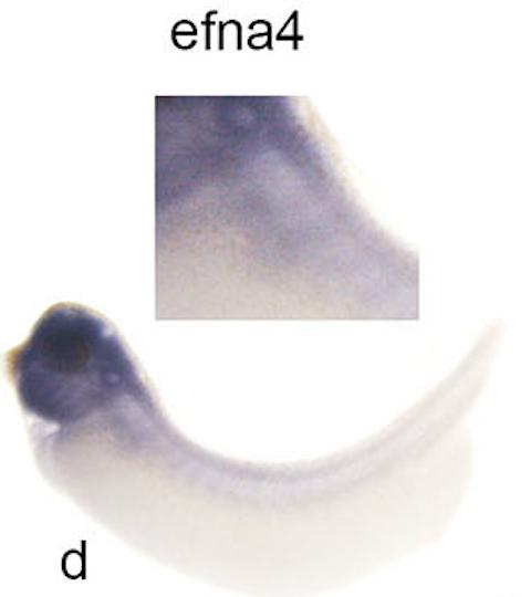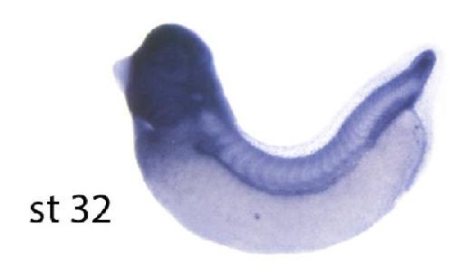 efna4 (ephrin A4) gene expression in X. laevis embryo, assayed whole-mount via in situ hybridization (WISH) at NF stage 32, lateral view anterior left, dorsal up.