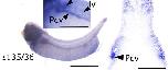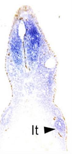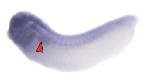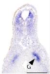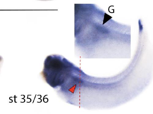 efna4 (ephrin A4) gene expression in X. laevis embryo, assayed whole-mount via situ hybridization (WISH) at NF stage 35 & 36, left image: lateral view, anterior left, dorsal up. right image, in transverse section at leel indicted by red dashed line.