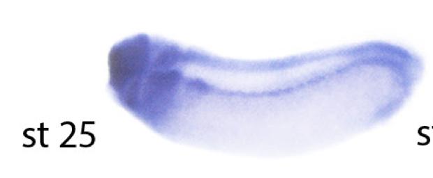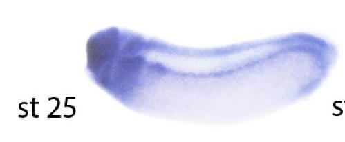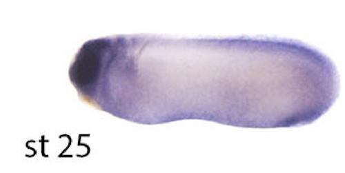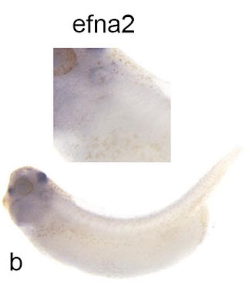 efna5 (ephrin A5) gene expression in X. laevis embryo, assayed whole-mount via in situ hybridization (WISH) at NF stage 25, lateral view anterior left, dorsal up.