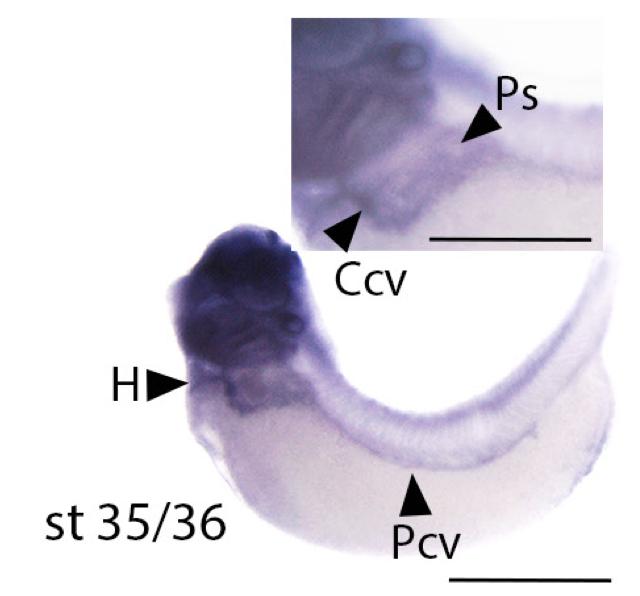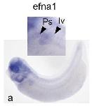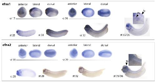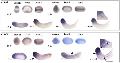 Supplemental Fig. 1. [efna4 and efna5] Expression of genes encoding ephrin-a ligands at stages of pronephric development from kidney field (neurula stages 17-18) to functional pronephros (early tadpole stage 35/36), except for efna3 that is shown in detail in Fig.3. Anterior, dorsal and lateral views are shown at neurula stages (stages 17-18, 20). Only lateral views are shown for tailbud stages 25, 28 and 32. A lateral view with the enlarged pronephric region is shown at early tadpole stage 35/36. From stage 25 onward, low levels of efna1 and a4 expression are detected at the level of the pronephric primordium, possibly in the associated developing vasculature. .... Expression of efna5 in the pronephric region is observed in the pronephric sinus (Ps). It is also observed in the vascular system, the intersomitic veins (Iv), the posterior cardinal vein (Pcv), the common cardinal vein (Ccv) and the heart (H). .....Scale bars: 1.7 mm for whole embryo, 0.5 mm for embryonic magnification.