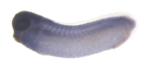 ephb1 (EPH receptor B1) gene expression in X. laevis embryo, assayed whole-mount via situ hybridization (WISH) at NF stage 32, lateral view, anterior left, dorsal up.