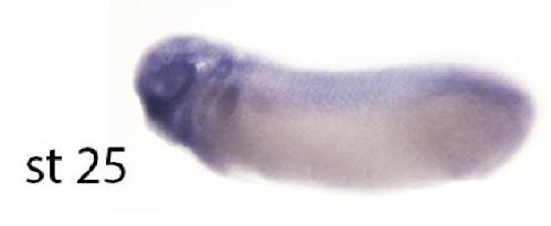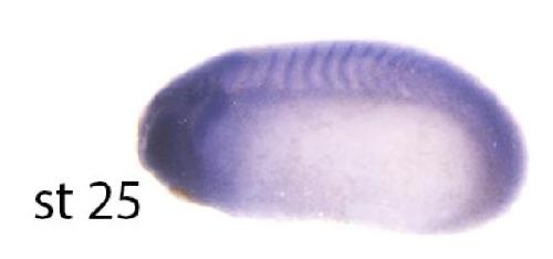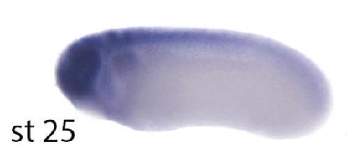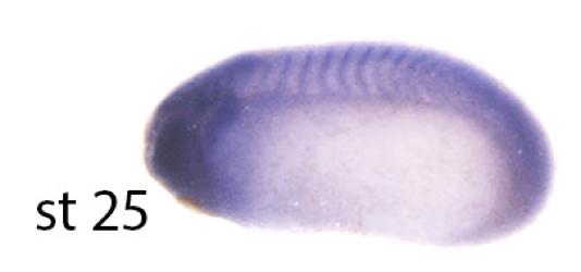 epha7 (EPH receptor A7) gene expression in X. laevis embryo, assayed whole-mount via situ hybridization (WISH) at NF stage 25, lateral view, anterior left, dorsal up.
