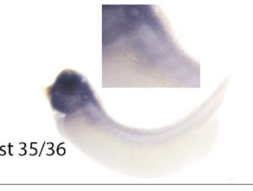efna1 (ephrin A1) gene expression in X. laevis embryo, assayed whole-mount via situ hybridization (WISH) at NF stage 35 & 36, lateral view, anterior left, dorsal up.