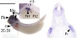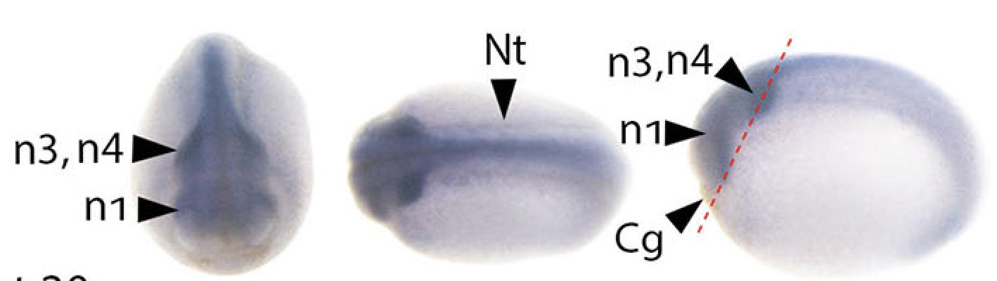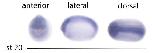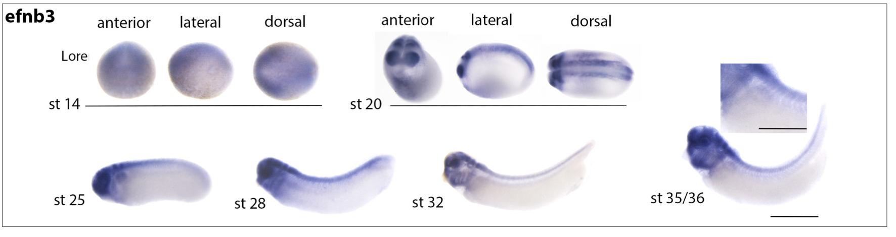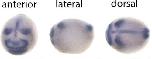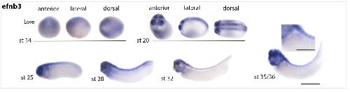 efnb3 (ephrin B3) gene expression in X. laevis embryo, assayed whole-mount via situ hybridization (WISH) at NF stage 20, anterior, lateral and dorsal views.
