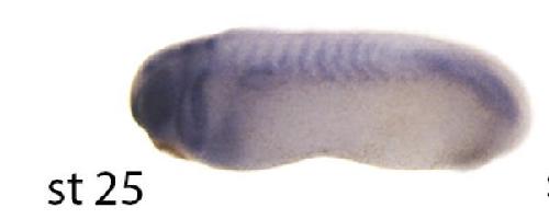 ephb2 (EPH receptor B2) gene expression in X. laevis embryo, assayed whole-mount via situ hybridization (WISH) at NF stage 25, lateral view, anterior left, dorsal up.