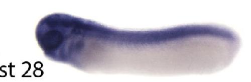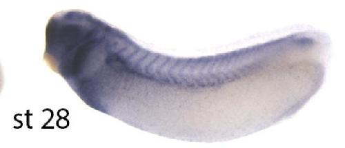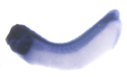 efnb2 (ephrin B2) gene expression in X. laevis embryo, assayed whole-mount via situ hybridization (WISH) at NF stage 28, lateral view anterior left, dorsal up.