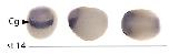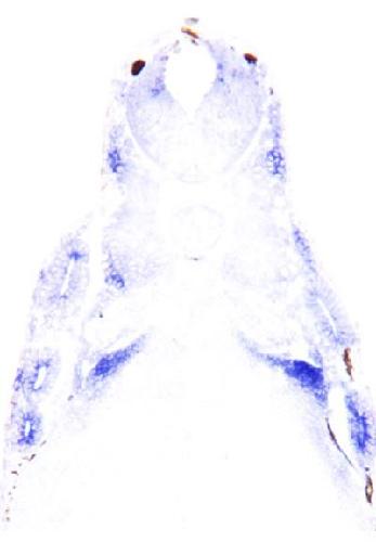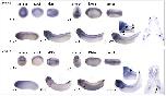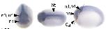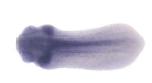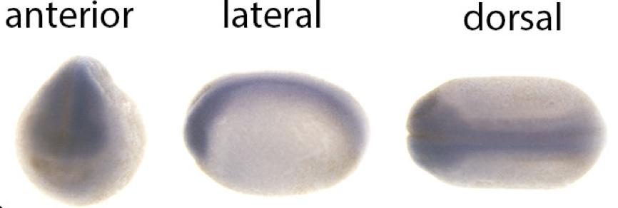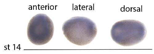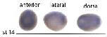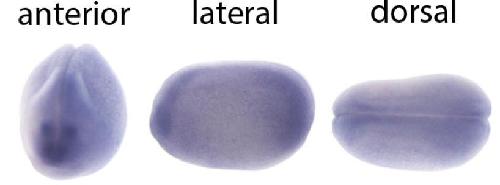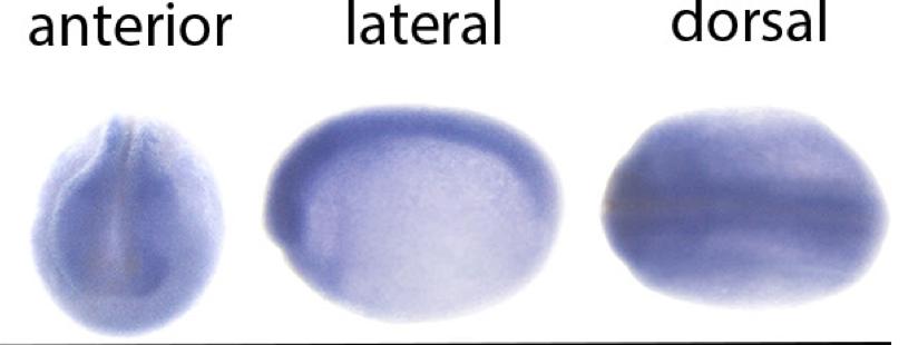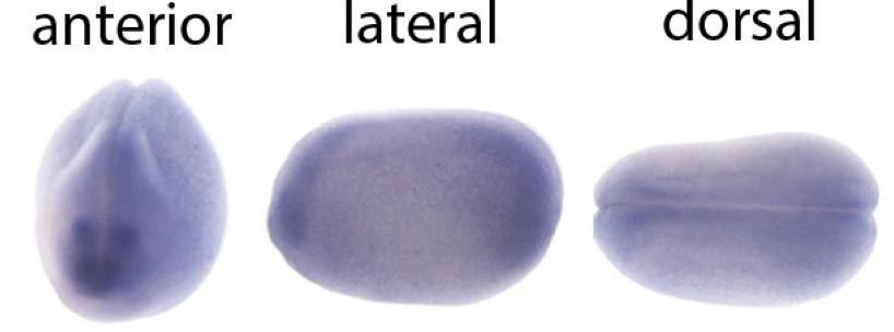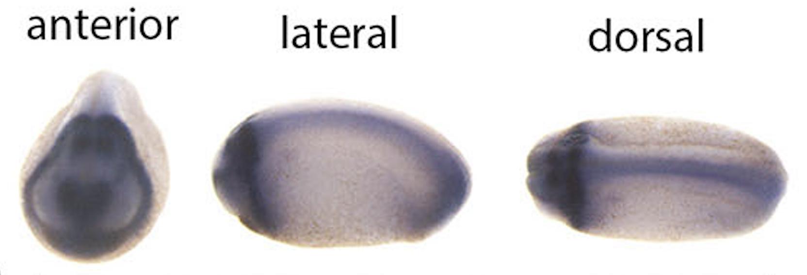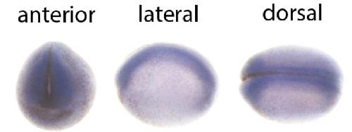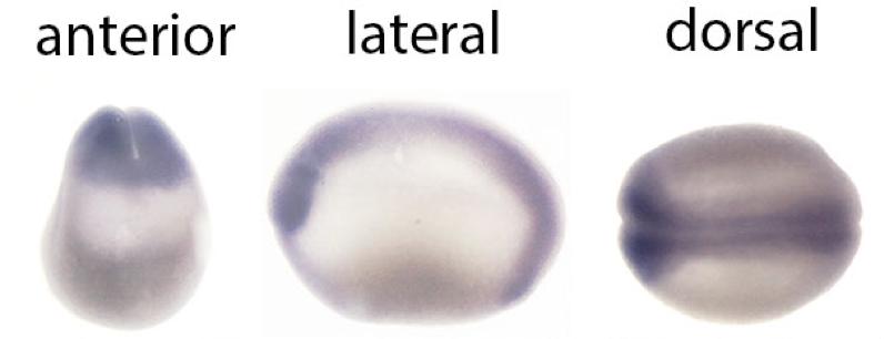 efnb1 (ephrin B1) gene expression in X. laevis embryo, assayed whole-mount via in situ hybridization (WISH) at NF stage 14, anterior, lateral and dorsal views.