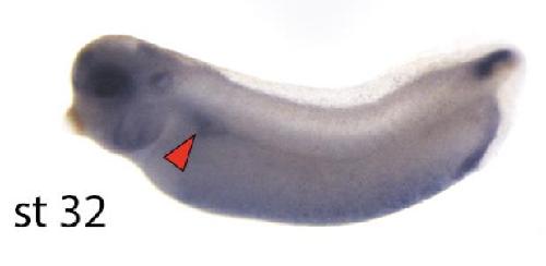 efnb1 (ephrin B1) gene expression in X. laevis embryo, assayed whole-mount via in situ hybridization (WISH) at NF stage 32, lateral view anterior left, dorsal up.