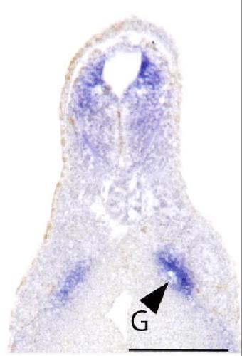 efnb1 (ephrin B1) gene expression in X. laevis embryo, assayed whole-mount via in situ hybridization (WISH) at NF stage 35/36, transverse section through trunk at the levele of the pronephros.