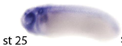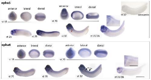 Supplemental Fig. 3. [epha2 and epha3] Expression of genes encoding receptors epha2, epha3, ..... at stages of pronephric development from kidney field (neurula stages 14-18) to functional pronephros (early tadpole stage 35/36). Anterior, dorsal and lateral views are shown at neurula stages (st14-18 and 20). Only lateral views are shown for tailbud stages 25, 28 and 32. A lateral view with the enlarged pronephric region is shown at early tadpole stage 35/36. Expression of epha2, a3 and a5 is observed in the region of the developing pronephros from stage 32 onward. .... For epha2, and epha3 .... in situ hybridization with the sense probes was shown at stage 32 as control. Scale bar: 1.7 mm for whole embryo, 0.5 mm for embryo magnification.