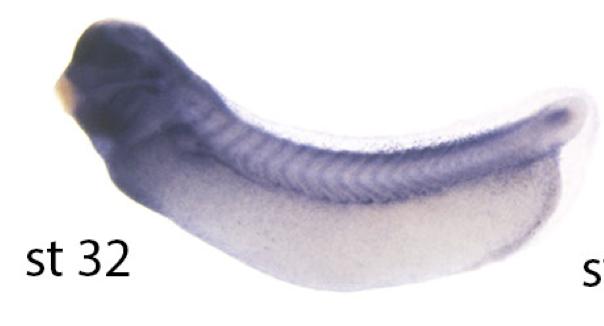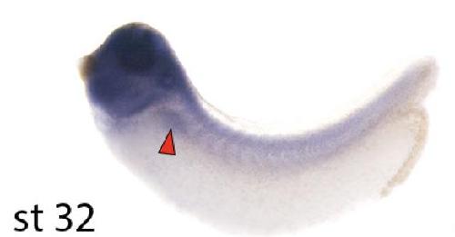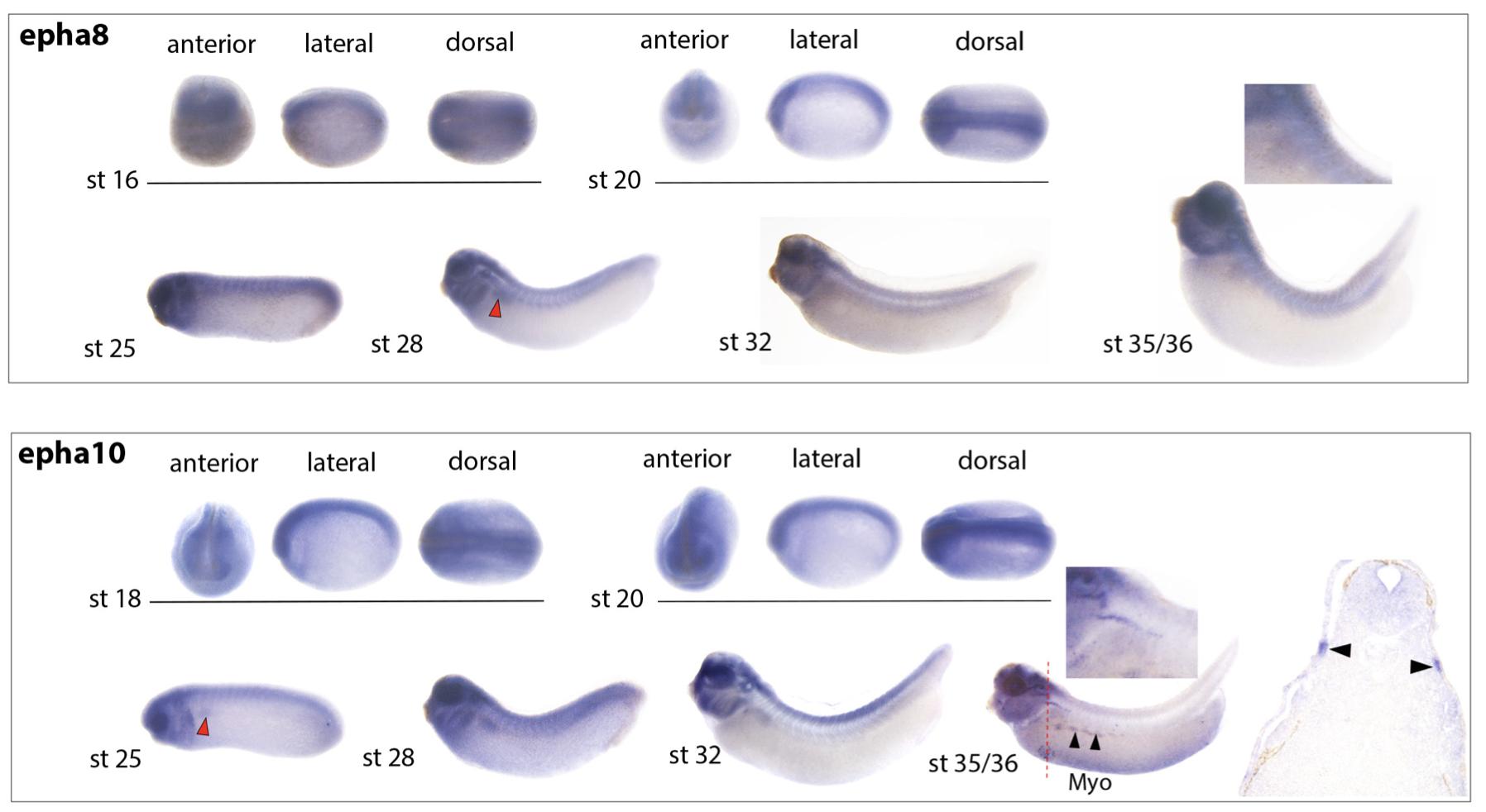 Supplemental Fig. 4. [epha8 and epha10] Expression of genes encoding receptors epha8, epha10, ..... at stages of pronephric development from kidney field (neurula stages 16-18) to functional pronephros (early tadpole stage 35/36). Anterior, dorsal and lateral views are shown at neurula stages (st16-18 and 20). Only lateral views are shown for tailbud stages 25, 28 and 32. A lateral view with the enlarged pronephric region is shown at early tadpole stage 35/36. Images of sectioned st 35/36 embryos are shown for epha10... with red dotted lines indicating the corresponding levels on whole mounts (note that the sections were not made from the whole mount specimen shown). Epha8 expression is observed in the developing pronephros (red arrowhead) from tailbud stage 28, while epha10 is transiently detected in the pronephros (red arrowhead) from tailbud stage 25 to 32. At tadpole stage 35/36 epha10 is not anymore expressed in pronephros, but rather in migrating hypaxial myoblasts (Myo). ..... Scale bar: 1.7 mm for whole embryo, 0.5 mm for embryo magnification and 280 μm for section.