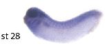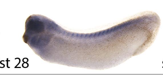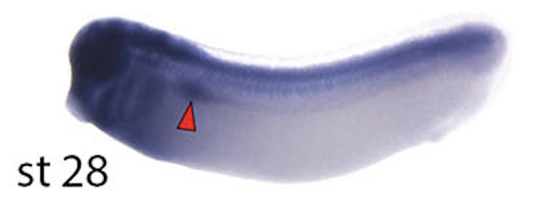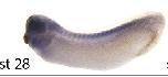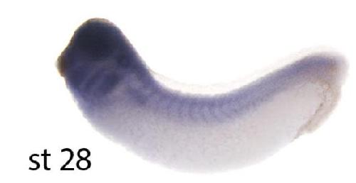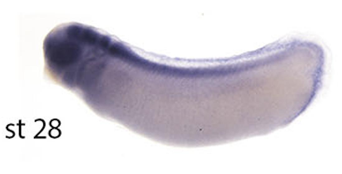 efna1 (ephrin A1) gene expression in X. laevis embryo, assayed whole-mount via situ hybridization (WISH) at NF stage 28, lateral view, anterior left, dorsal up.