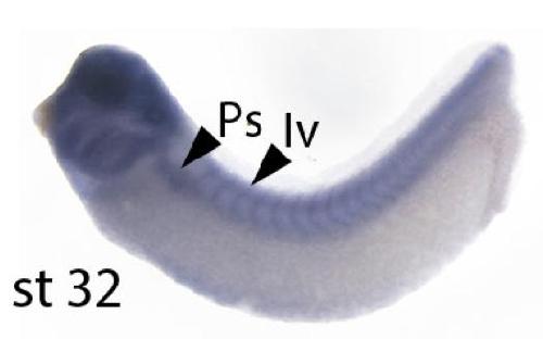 Supplemental Fig. 3.[epha5 and epha6] Expression of genes encoding receptors ..... epha5 and epha6 at stages of pronephric development from kidney field (neurula stages 14-18) to functional pronephros (early tadpole stage 35/36). Anterior, dorsal and lateral views are shown at neurula stages (st14-18 and 20). Only lateral views are shown for tailbud stages 25, 28 and 32. A lateral view with the enlarged pronephric region is shown at early tadpole stage 35/36. Expression of epha2, a3 and a5 is observed in the region of the developing pronephros from stage 32 onward. Epha6 is detected as soon as the tailbud stage 25. At stage 32 it is detected in the forming intersomitic veins (Iv) and pronephric sinus (Ps). For epha5, in situ hybridization with the sense probes was shown at stage 32 as control. Scale bar: 1.7 mm for whole embryo, 0.5 mm for embryo magnification.