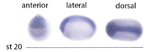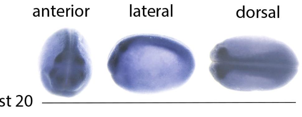 efna4 (ephrin A4) gene expression in X. laevis embryo, assayed whole-mount via situ hybridization (WISH) at NF stage 20, anterior, lateral and dorsal views.