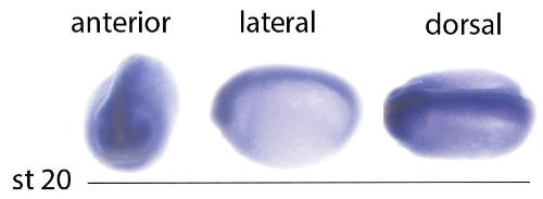 epha7 (EPH receptor A7) gene expression in X. laevis embryo, assayed whole-mount via situ hybridization (WISH) at NF stage 20, anterior, lateral and dorsal views.