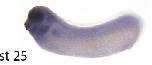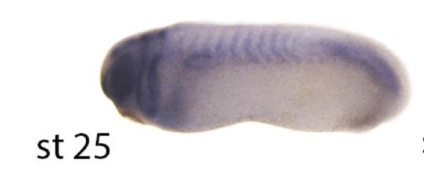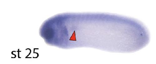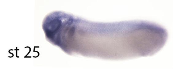 efna3 (ephrin A3) gene expression in X. laevis embryo, assayed whole-mount via situ hybridization (WISH) at NF stage 25, dorsal view, anterior left, showing expression in craniial neural crest streams of the first pharygeal arch around the eye, dorsal aspects of neural tube and as well as the third and fourth pharyngeal arches .