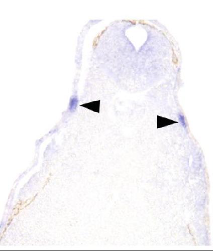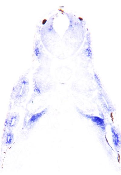 ephb3 (EPH receptor B3) gene expression in X. laevis embryo, assayed whole-mount via situ hybridization (WISH) at NF stage 35 & 36, transverse section through trunk, at level of the pronephros, dorsal up.