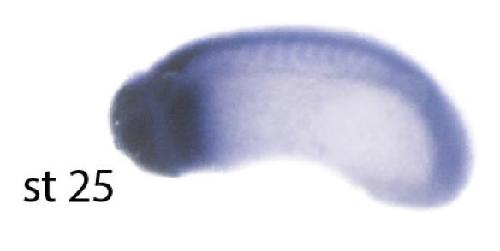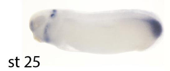 efna4 (ephrin A4) gene expression in X. laevis embryo, assayed whole-mount via in situ hybridization (WISH) at NF stage 25, lateral view anterior left, dorsal up.