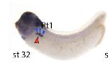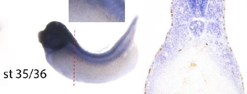 epha7 (EPH receptor A7) gene expression in X. laevis embryo, assayed whole-mount via situ hybridization (WISH) at NF stage 35 & 36, left image: lateral view, anterior left, dorsal up; right image: transverse section through trunk as level of red line.