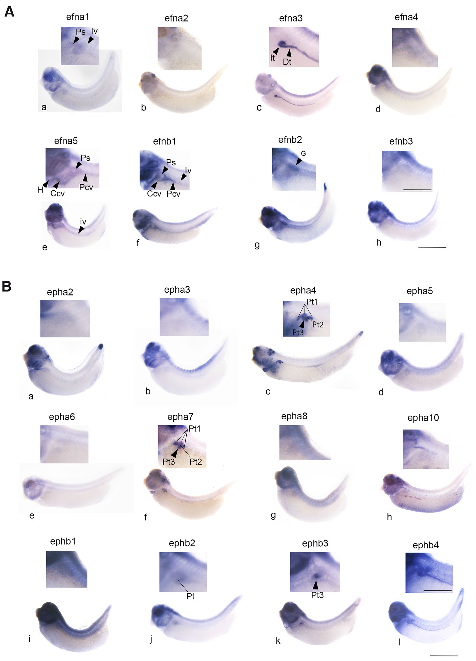 Fig. 1. Expression of genes encoding the members of the Eph-ephrin signaling components in the pronephros at early tadpole stage 35/36. The enlarged region corresponding to the pronephric region is shown with a general view of the tadpole. (A) Genes encoding ephrin ligands. Expression of efna3 and b2 is detected in the developing pronephros; efna3 is expressed in the intermediate and distal segments of the tubule (It, Dt). Expression of efnb2 is observed in the glomus region (G). Expression of efna5 and b1 is detected at the level of the vessels associated with the pronephros: in the pronephric sinus (Ps), the posterior cardinal vein (Pcv), the common cardinal vein (Ccv) and the intersomitic veins (Iv). Efna5 expression is also observed in the heart (H). Efna1 seems to be weakly expressed in the pronephric sinus and intersomitic vein. Scale bars: 0.8 mm for whole embryo and 0.3 mm for embryo magnification. (B) Genes encoding Eph receptors. Expression of epha4, a7, b3 and b2 are clearly detected in the pronephros. Epha4 and EphA7 are expressed in the PT1, PT2 and PT3 segments of the proximal tubule (Pt1, three lines, Pt2, line and Pt3 arrowhead) while ephb3 is detected only in PT3 (arrowhead). Ephb2 is detected in the proximal, intermediate and the first distal segment of the tubule. No pronephric expression of epha2, a3, a5, a6, a8, a10 and b1 is observed. Expression of ephb4 is detected in the vessels associated with the pronephros. Pt, It, Dt: proximal, intermediate and distal tubule. Scale bars: 1.7 mm for whole embryo and 0.5 mm for embryo magnification.