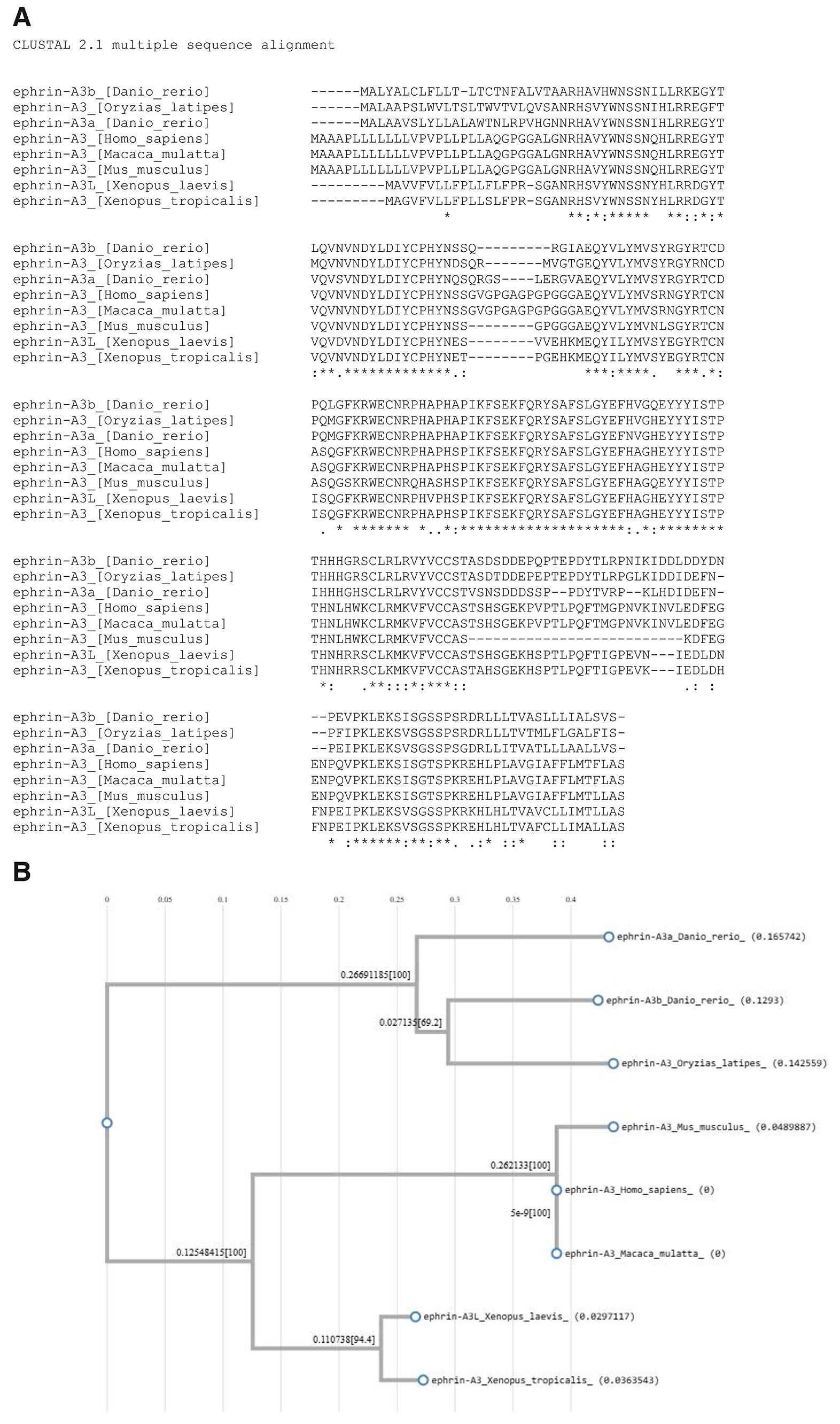 (A) Multiple alignment of vertebrate efna3 protein sequences. (B) Phylogenetic tree. List of accession numbers used for sequences analysis is shown in the Materials and Methods section.