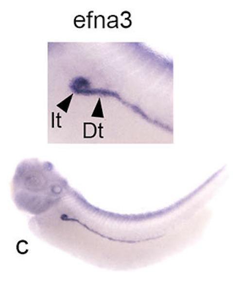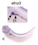 efna3 (ephrin A3) gene expression in X. laevis embryo, assayed whole-mount via situ hybridization (WISH) at NF stage 35 & 36, lateral view, anterior left, dorsal up.