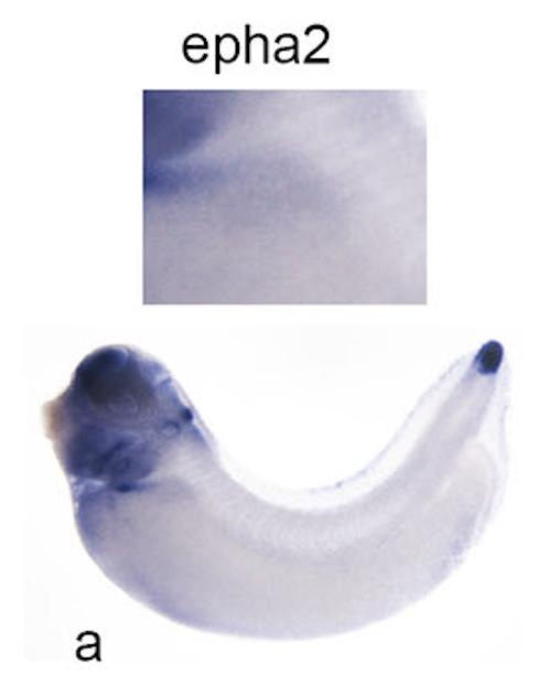 epha2 (EPH receptor A2) gene expression in X. laevis embryo, assayed whole-mount via situ hybridization (WISH) at NF stage 32, lateral view anterior left, dorsal up.
