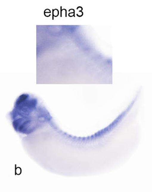 epha3 (EPH receptor A3) gene expression in X. laevis embryo, assayed whole-mount via situ hybridization (WISH) at NF stage 32, lateral view anterior left, dorsal up.