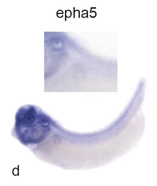 epha5 (EPH receptor A5) gene expression in X. laevis embryo, assayed whole-mount via situ hybridization (WISH) at NF stage 25, lateral view anterior left, dorsal up.