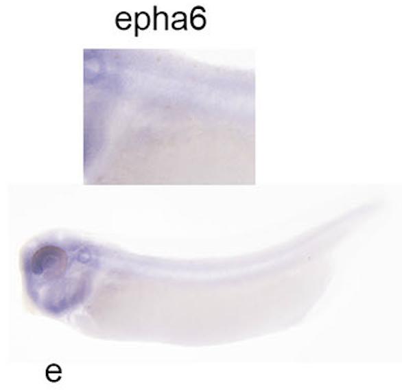 epha6 (EPH receptor A6) gene expression in X. laevis embryo, assayed whole-mount via situ hybridization (WISH) at NF stage 32, lateral view anterior left, dorsal up.