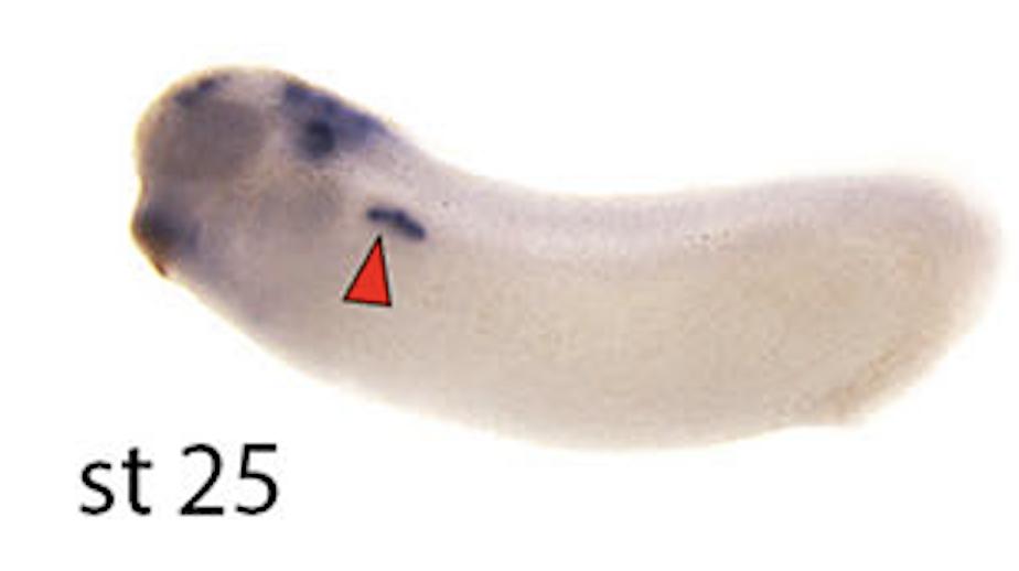 efnb1 (ephrin B1) gene expression in X. laevis embryo, assayed whole-mount via in situ hybridization (WISH) at NF stage 25, lateral view anterior left, dorsal up.