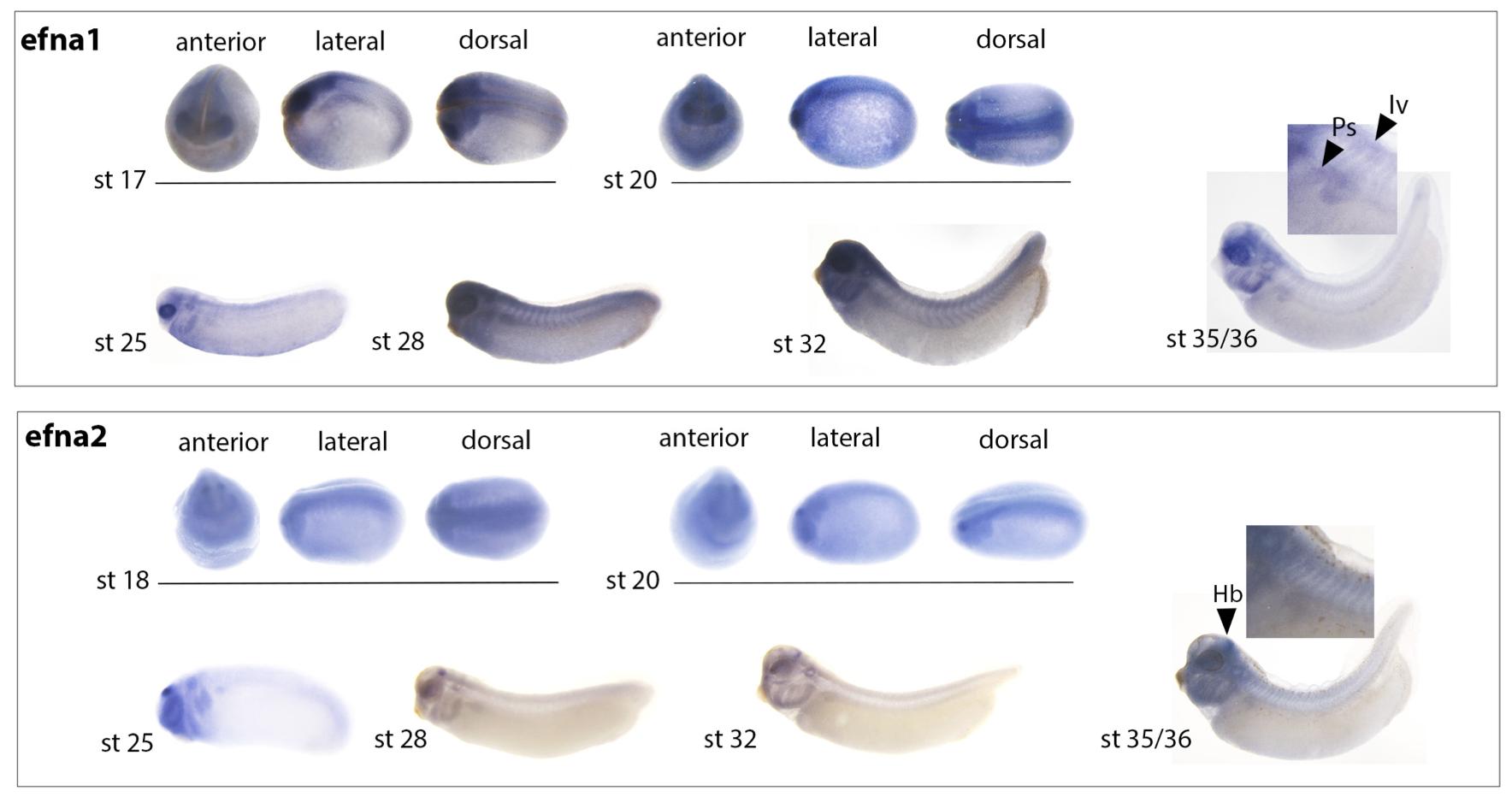 Supplemental Fig. 1. [efna1 and efna2] Expression of genes encoding ephrin-a ligands at stages of pronephric development from kidney field (neurula stages 17-18) to functional pronephros (early tadpole stage 35/36), except for efna3 that is shown in detail in Fig.3. Anterior, dorsal and lateral views are shown at neurula stages (stages 17-18, 20). Only lateral views are shown for tailbud stages 25, 28 and 32. A lateral view with the enlarged pronephric region is shown at early tadpole stage 35/36. From stage 25 onward, low levels of efna1 [and efna4] expression are detected at the level of the pronephric primordium, possibly in the associated developing vasculature. At the early tadpole stage (stage 35/36), efna1 is expressed in the vasculature associated to the pronephric region. .... Expression of efna2 is detected in the Hindbrain (Hb) at stage 35/36. Scale bars: 1.7 mm for whole embryo, 0.5 mm for embryonic magnification.