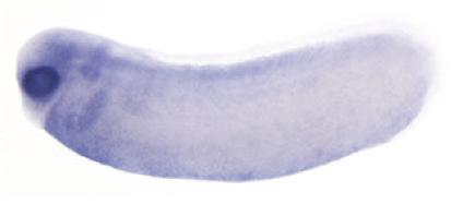 efna1 (ephrin A1) gene expression in X. laevis embryo, assayed whole-mount via situ hybridization (WISH) at NF stage 35/36, lateral view anterior left, dorsal up.