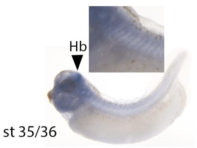 efnb3 (ephrin B3) gene expression in X. laevis embryo, assayed whole-mount via situ hybridization (WISH) at NF stage 35/36, lateral view anterior left, dorsal up.