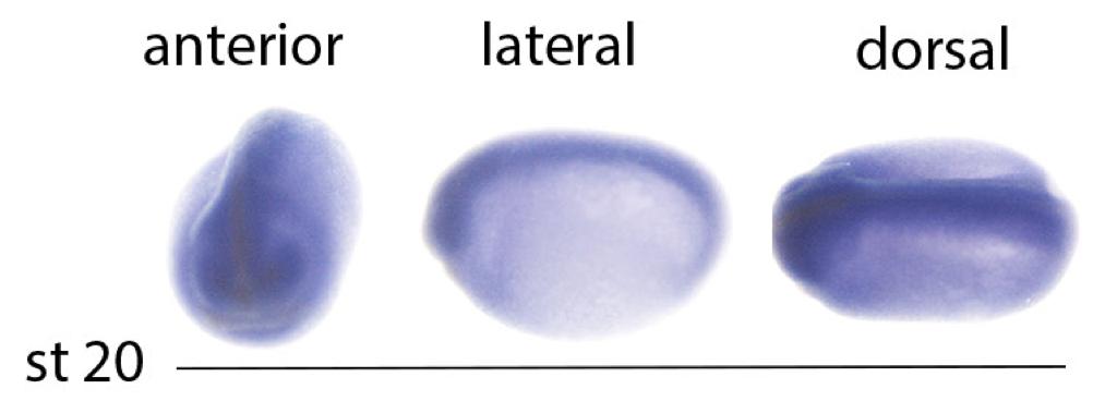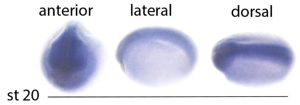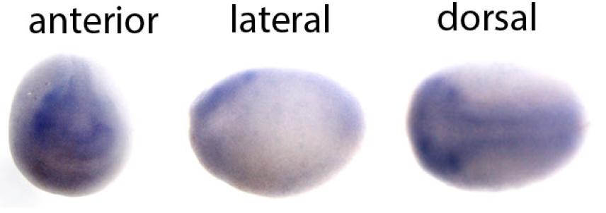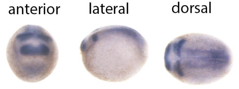 epha2 (EPH receptor A2) gene expression in X. laevis embryo, assayed whole-mount via situ hybridization (WISH) at NF stage 20, anterior, lateral and dorsal views.