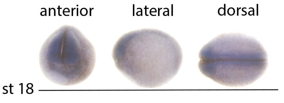 efna2 (ephrin A2) gene expression in X. laevis embryo, assayed whole-mount via situ hybridization (WISH) at NF stage 18, anterior, lateral and dorsal views.