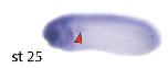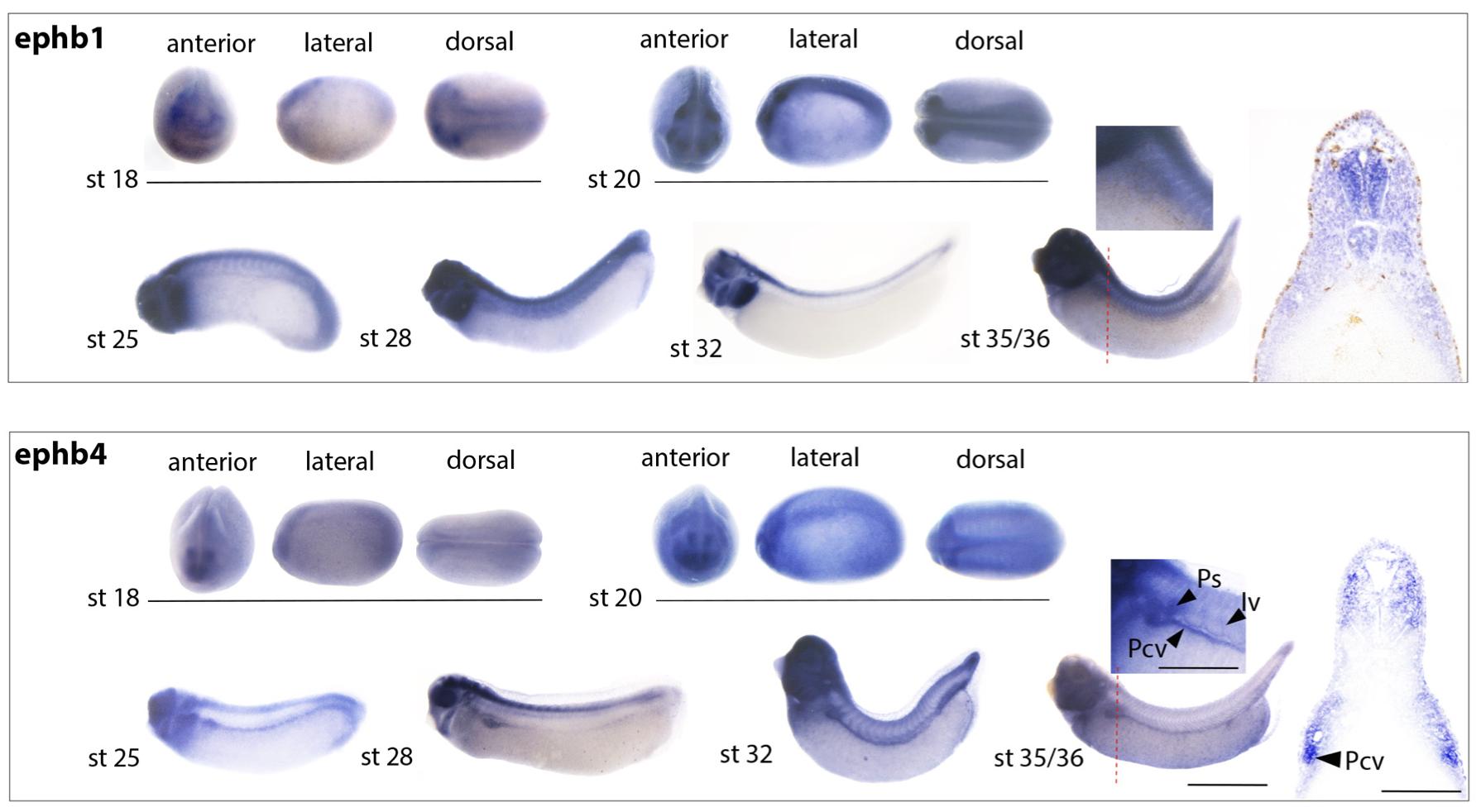 Supplemental Fig. 4. [ephb1 and ephb4]. Expression of genes encoding receptors ephb1 and ephb4 at stages of pronephric development from kidney field (neurula stages 16-18) to functional pronephros (early tadpole stage 35/36). Anterior, dorsal and lateral views are shown at neurula stages (st16-18 and 20). Only lateral views are shown for tailbud stages 25, 28 and 32. A lateral view with the enlarged pronephric region is shown at early tadpole stage 35/36. Images of sectioned st 35/36 embryos are shown for .... ephb1 and ephb4 with red dotted lines indicating the corresponding levels on whole mounts (note that the sections were not made from the whole mount specimen shown)......