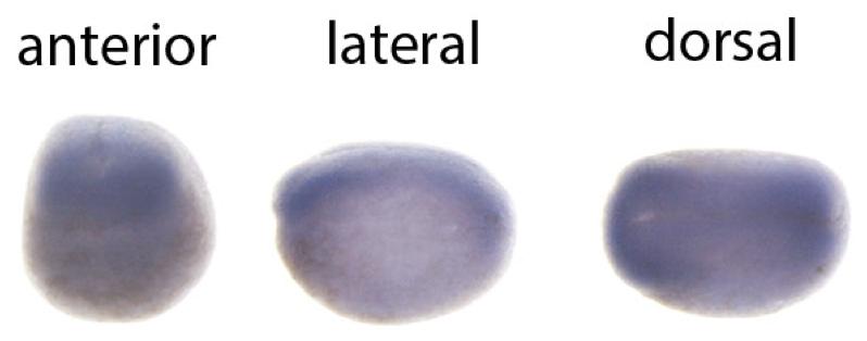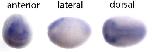 efna1 (ephrin A1) gene expression in X. laevis embryo, assayed whole-mount via situ hybridization (WISH) at NF stage 20, anterior, lateral and dorsal views.