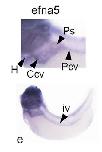 efna5 (ephrin A5) gene expression in X. laevis embryo, assayed whole-mount via in situ hybridization (WISH) at NF stage 28, lateral view anterior left, dorsal up.