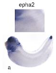 epha2 (EPH receptor A2) gene expression in X. laevis embryo, assayed whole-mount via situ hybridization (WISH) at NF stage 25, lateral view anterior left, dorsal up.