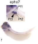 epha7 (EPH receptor A7) gene expression in X. laevis embryo, assayed whole-mount via situ hybridization (WISH) at NF stage 35/36, lateral view anterior left, dorsal up.