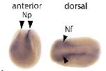 efna3 (ephrin A3) gene expression in X. laevis embryo, assayed whole-mount via situ hybridization (WISH) at NF stage 14 anterior and dorsal views, illustrating expression in the primary neuronal precursors (Np), and in the anterior neural folds (Nf).