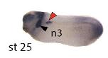 efna3 (ephrin A3) gene expression in X. laevis embryo, assayed whole-mount via situ hybridization (WISH) at NF stage 20, anterior view, dorsal up. showing expression in the neural tube, and in the emerging first (n1) and third/fourth (n3, n4) pharyngeal arches of the cranial neural crest.