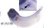 ephb3 (EPH receptor B3) gene expression in X. laevis embryo, assayed whole-mount via situ hybridization (WISH) at NF stage 35 & 36, lateral view, anterior left, dorsal up.